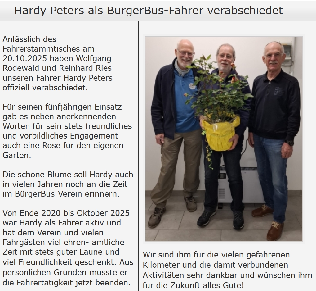 Nachfolger gesucht Anfang Oktober hatte unser BürgerBus einen Kilometerstand von über Zeit also, schon einmal zu schauen, welcher Nachfolger-BürgerBus infrage kommt.333 333 Kilometer erreicht! Reinhard Ries hatte am 18.10.2025 die Möglichkeit organisiert, sowohl in Thedinghausen, als auch in Achim die dort in diesem Jahr neu in Betrieb genommenen BürgerBusse anzuschauen. Mit Renate Meyer, Delfried Buse, Horst Drewes und Christian Müller hatten sich vier Fahrer zur Teilnahme angemeldet. Reinhard Ries und Wolfgang Rodewald vertraten den Vorstand. ![]() Um 12 Uhr stand Fred Schröder in Lunsen für alle Fragen zum Thedinghauser BürgerBus zur Verfügung. Die holländische Firma Tribus verwendet ein MAN-Fahrgestell und der Bus ist mit 6,84 m Länge, 2,82 m Höhe und einer Breite von 2,59 m (mit Außenspiegel / fest aber einklappbar) fast einen Meter länger, als der Kirchlintler Bus. Positiv fielen die gute Ausstattung und die qualitativ gute Verarbeitung auf. In Thedinghausen betrug die Lieferzeit allerdings fast ein Jahr. ![]() Kurz vor 14 Uhr konnte dann der auf einem Toyota-Fahrgestell montierte Bus in Achim angeschaut werden. Reinhard Viohl vom Achimer Verein nahm sich viel Zeit und gab etliche wertvolle Hinweise. Mit 5,98 m Länge, 2,72 m Höhe und 2,14 m Breite (ohne Außenspiegel / abnehmbar) weist der Achimer Bus ähnliche Maße auf, wie der Kirchlintler. Vorteilhaft bei diesem Modell ist insbesondere der stufenlose Innenraum und – wegen der komprimierten Außenmaße - eine gute Wendigkeit. Auch die Achimer mussten allerdings fast ein Jahr auf den neuen Bus warten. Beim Fahrerstammtisch am 20.10.2025 besteht die Möglichkeit, noch einmal darüber zu diskutieren, welches Model jetzt in Kirchlinteln als Nachfolge-Bus favorisiert wird. |